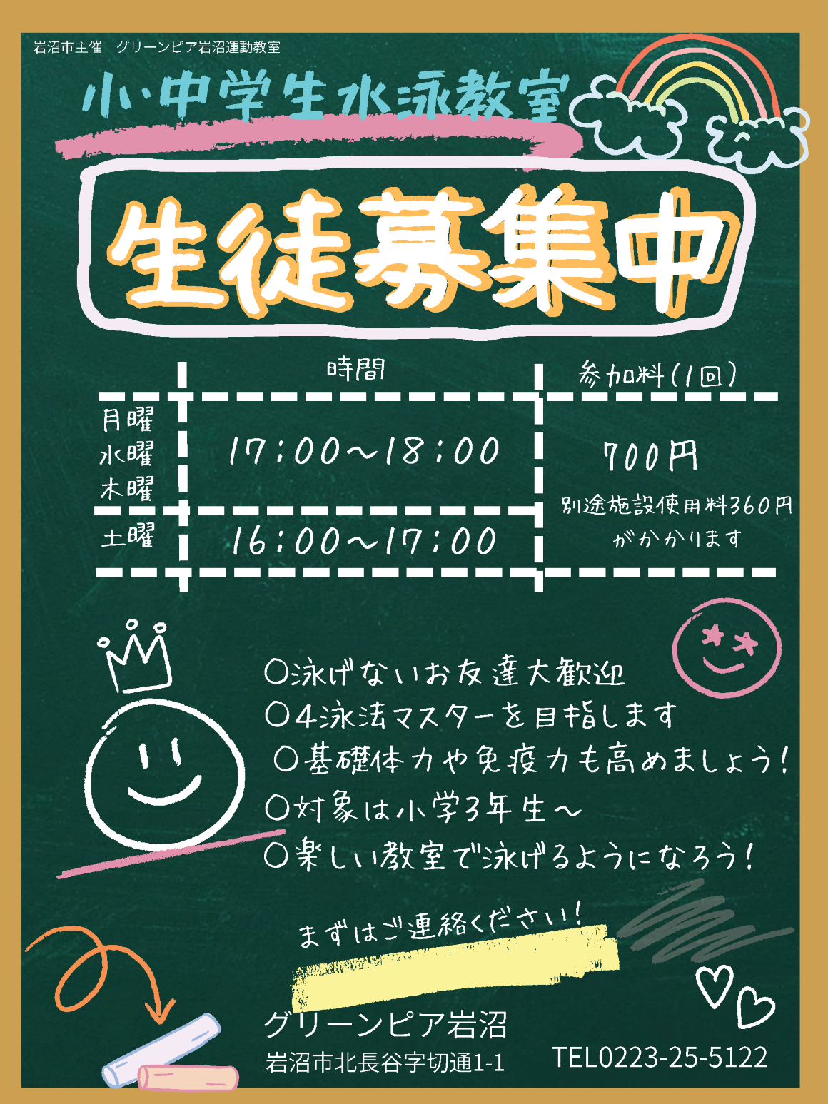 4泳法完泳を目標とします。水泳を通して体力向上も目指します。